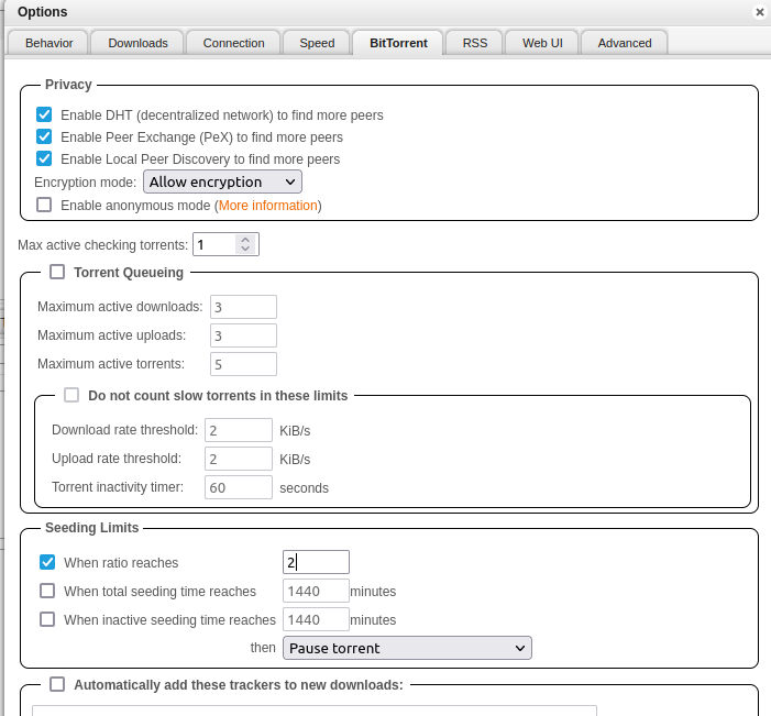In Bittorrent, set desired seed ratio under seeding limits