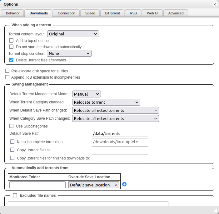 In Downloads settings, set the save path to be the one set in the docker-compose file and set 'When default save path changed' and 'When default category path changed' to 'relocate torrents'
